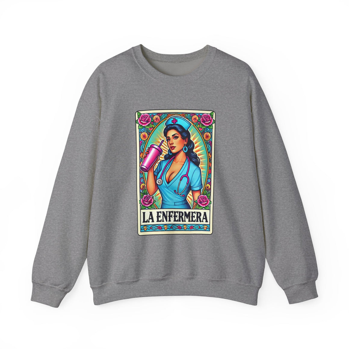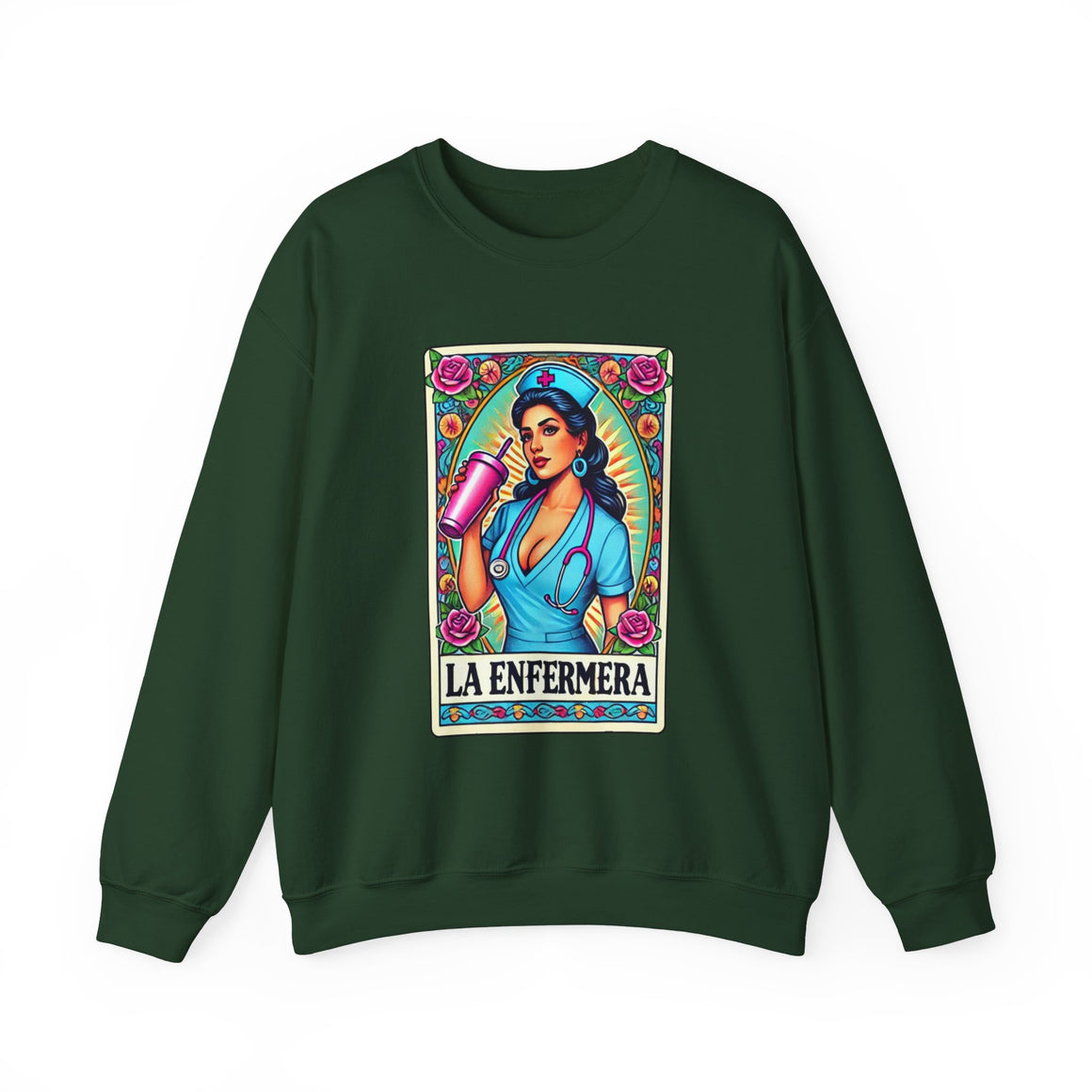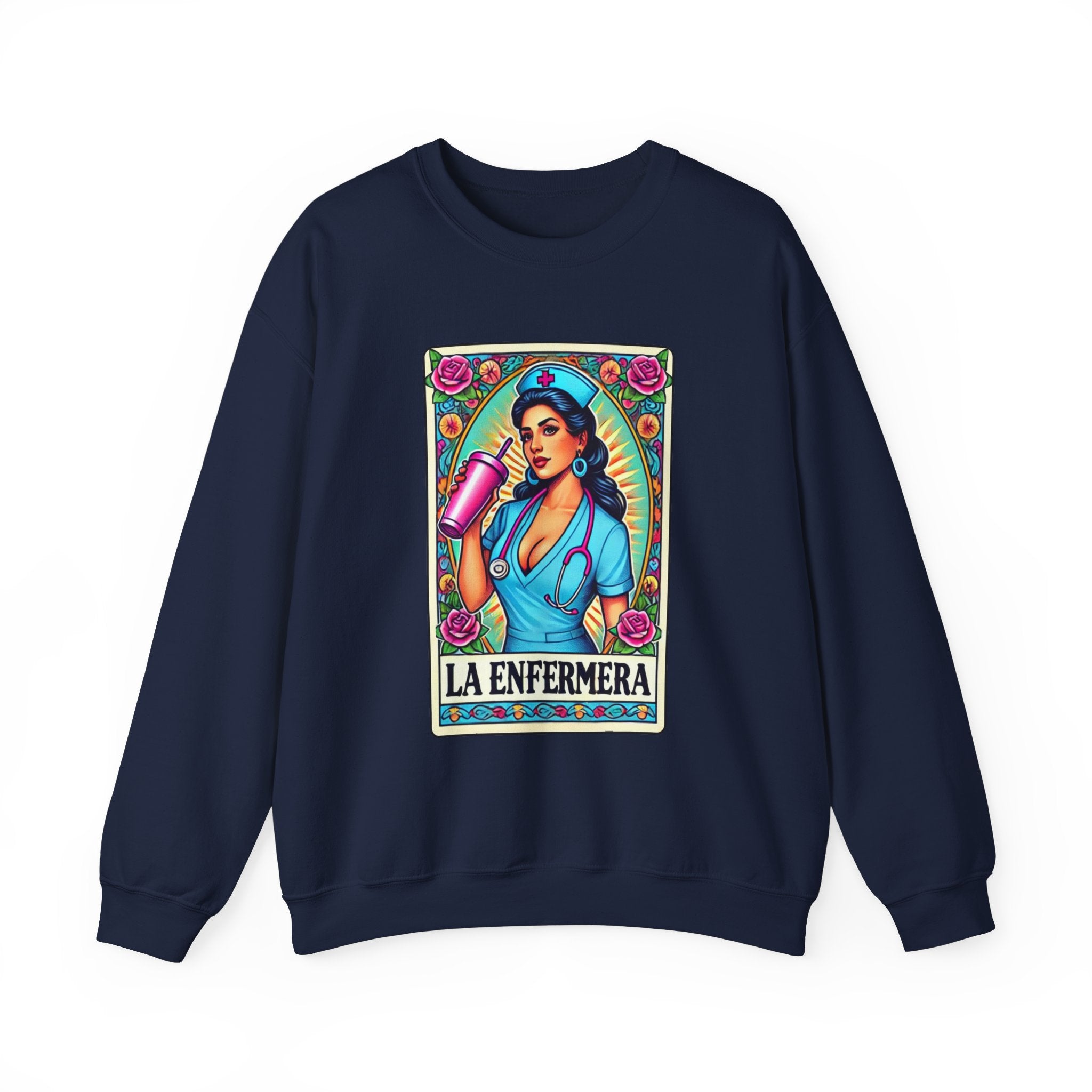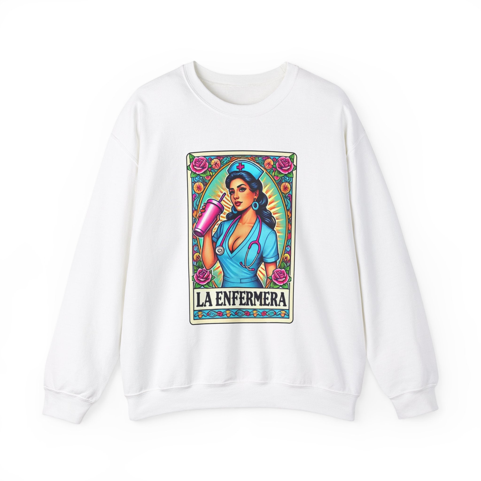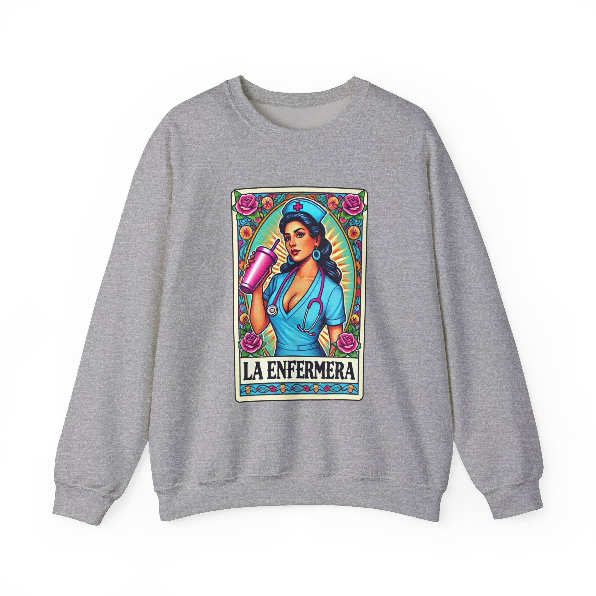 Stay warm and stylish with our "La Enfermera" unisex heavy blend sweatshirt, featuring a stunning and empowered depiction of a beautiful Hispanic nurse in the iconic Loteria card style. Perfect for nurses, healthcare workers, and anyone who loves unique, culturally inspired designs, this sweatshirt offers both comfort and durability.